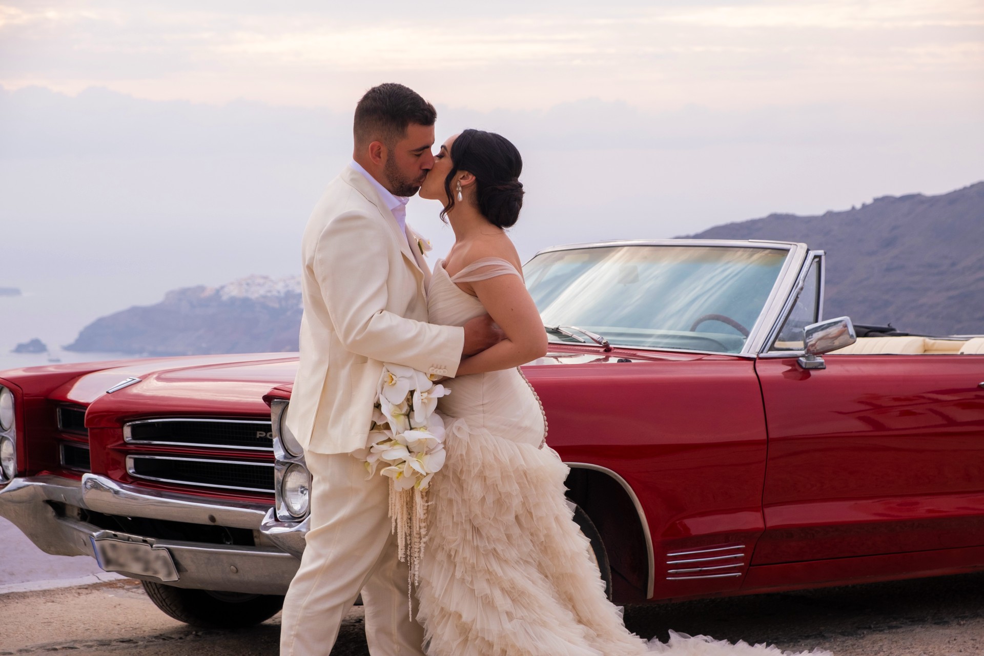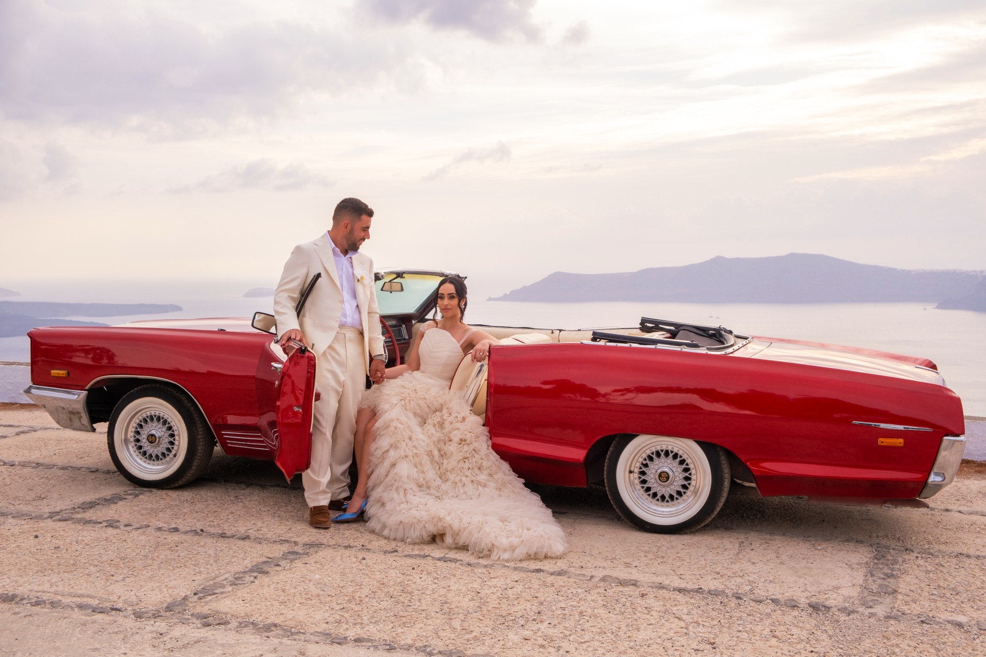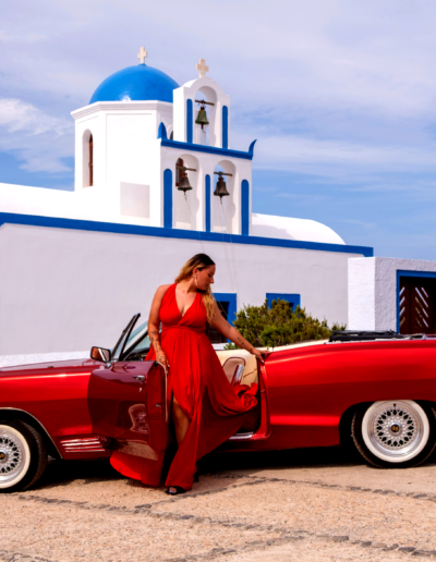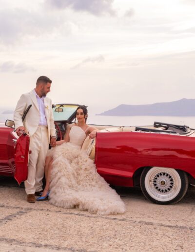 For your special wedding day, we will decorate the car, thus creating the perfect canvas for your photoshoot. We will enrich the experience with a glass of champagne to celebrate this unique moment. Take in the enchanting sunset of Santorini as you lay back in our car on the way back.